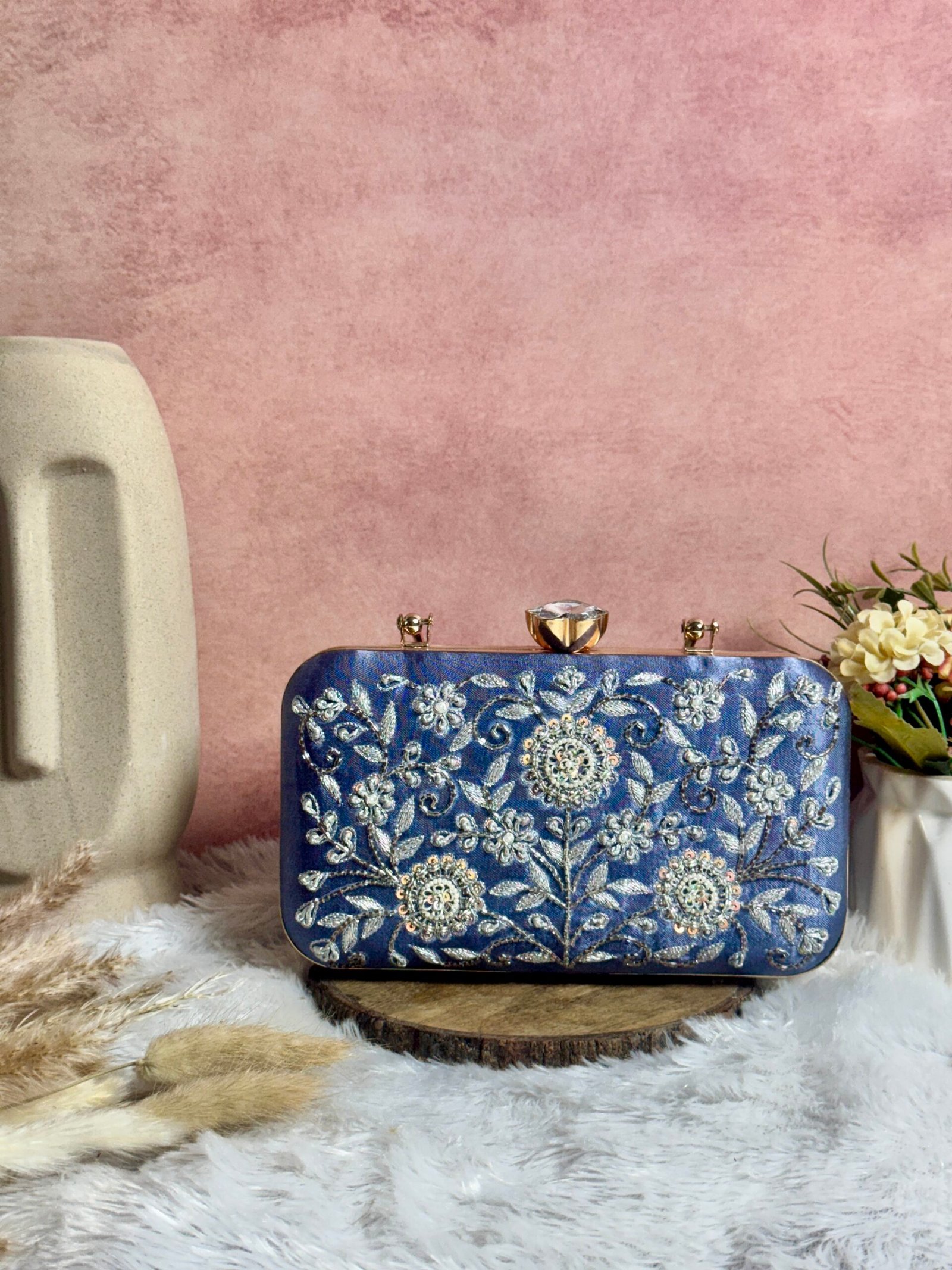 An exquisite silver-toned clutch, adorned with intricate floral embroidery in shimmering threadwork and sequins. The structured design, complemented by a sleek gold handle and an elegant clasp, makes it a perfect blend of sophistication and charm. A statement accessory for evening soirées, weddings, and festive occasions.